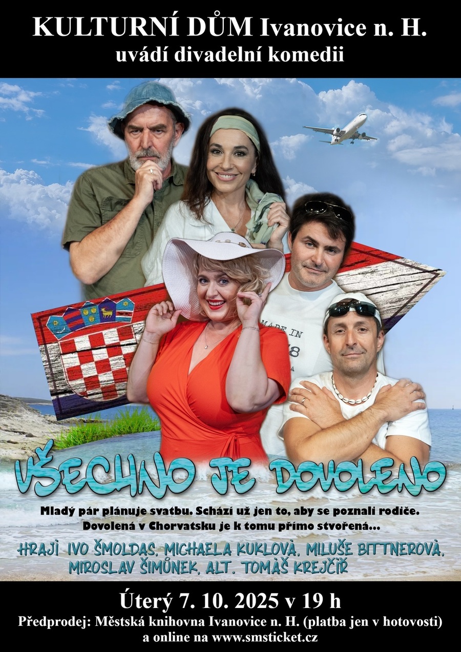 Kulturní dům Ivanovice na Hané Vás zve v úterý 7. 10. 2025 v 19 h na divadelní komedii VŠECHNO JE DOVOLENO.