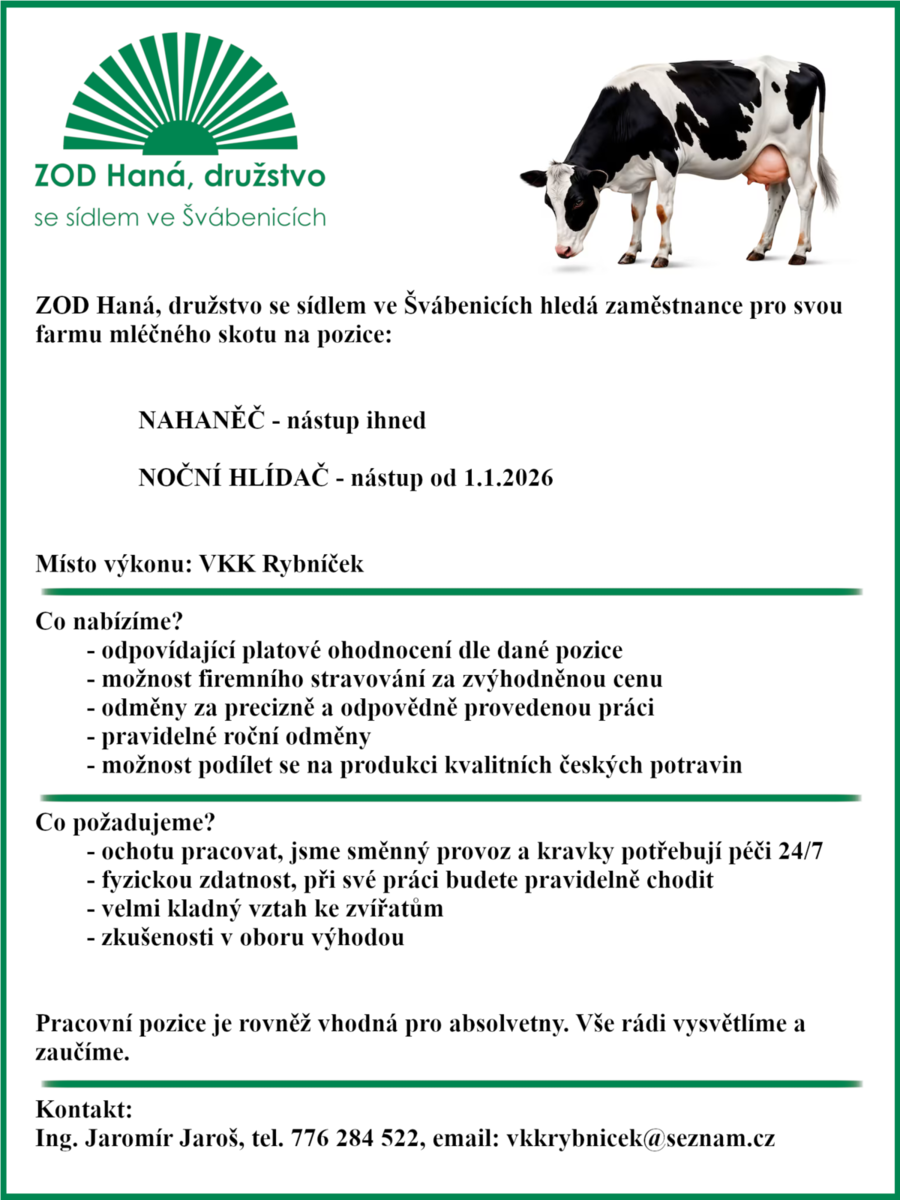 ZOD Haná, družstvo hledá zaměstnance pro farmu skotu v Rybníčku, aktuálně nabízí volné pozice nahaněč s nástupem ihned a noční hlídač s nástupem od 1.ledna 2026. Obě pozice pracují ve směnném provozu a samozřejmostí je kladný vztah ke zvířatům. Pozice jsou vhodné i bez předchozích zkušeností v oboru. Za odvedenou práci nabízíme odpovídající platové ohodnocení, dále prémie, pravidelné roční odměny a v neposlední řadě možnost zvýhodněného stravování.