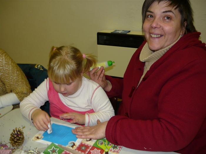 Všichni se pak přesunuli do sálu kulturního domu, kde už bylo pro všechny děti připraveno vše k výrobě různých vánočních ozdob a dárečků. Zajímavé bylo, že tato tvořivá činnost nezaujala jen děti, ale také i dospělé. Na stolech byly připraveny barevné papíry, korálky, chvojí na výrobu vánočních svícínků, lepidla a mnoho jiných potřeb, bez kterých by se naše vánoční dílnička neobešla.