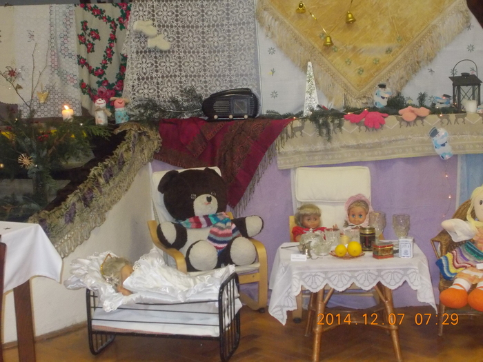 Výstava byla koncipována tak, aby zaujala také malé děti. Před vánočním stromečkem se spoustou dárků připravovala perníčky medvědí rodinka. V pozadí seděly u stolečku panenky popíjející svůj odpolední čaj. Pokukovala po nich skupinka plyšových medvídků pod dohledem statných sněhuláků.